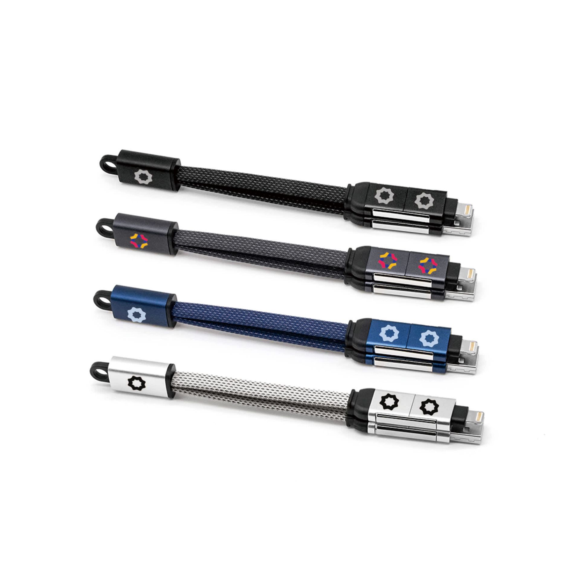 Upgrade your charging essentials with our 60W 4-in-1 Braided Charging Cable with Keyring. Crafted from premium aluminium alloy and braided fabric, this 16.5cm cable is durable, portable, and built to last. Available in four stylish colours, it can be customized with your logo using screen print, UV print, or engraving. With four versatile connectors, it supports 60W fast charging and high-speed data transfer about 33.1 Mb/s, making it perfect for powering phones, tablets, and even laptops. Compact and convenient with its keyring design, it is ideal for home, office, travel, or promotional use.