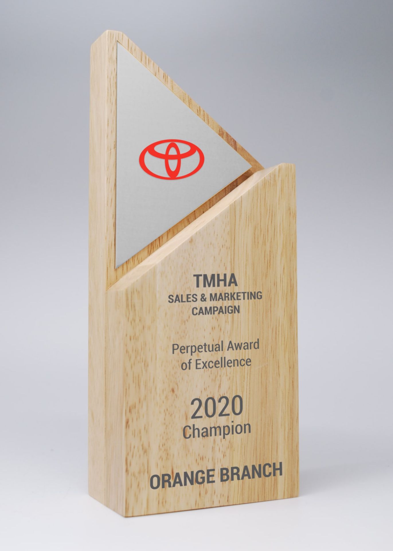 This contemporary arrow award brings the traditional elegant feel of a timber award with a modern twist. Using a decorative full colour printed silver plate with the option extra of digital print onto the timber, this award is bound to impress._x000D_ _x000D_ These Sustainable Timber Trophies are made in Vietnam using plantation grown Rubberwood. These Wood Trophies help contribute to the income of Vietnamese regional cottage industry farmers._x000D_ _x000D_ Using simple shapes embellished with fresh graphic type styles we imprint your important recognition icon with Direct Full Colour Print._x000D_ _x000D_ The default displayed price displayed includes the print on the full metal surface as displayed._x000D_ Optional Direct Full Colour Print onto the timber surface is available._x000D_ These awards are not gift boxed