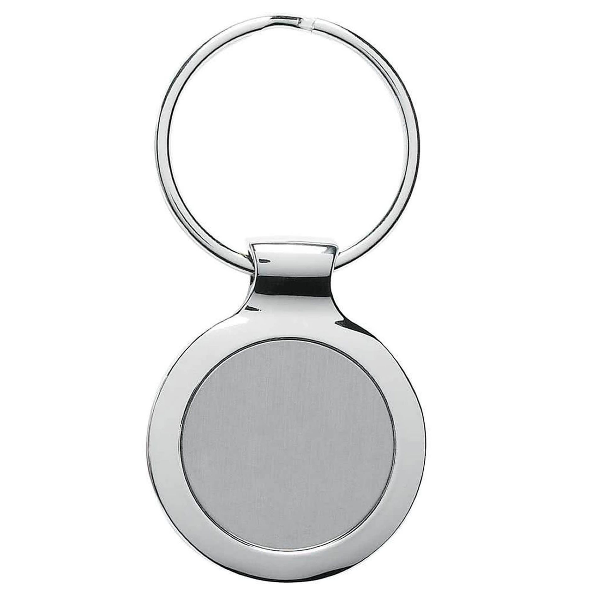 This elegant design keyring is one of most popular keyrings and can be used for almost every single promotional events. It features a simple design a round brush finishing panel in middle framed by chromed shiny base which highlights the corporate logo and information made of zinc alloy metal.