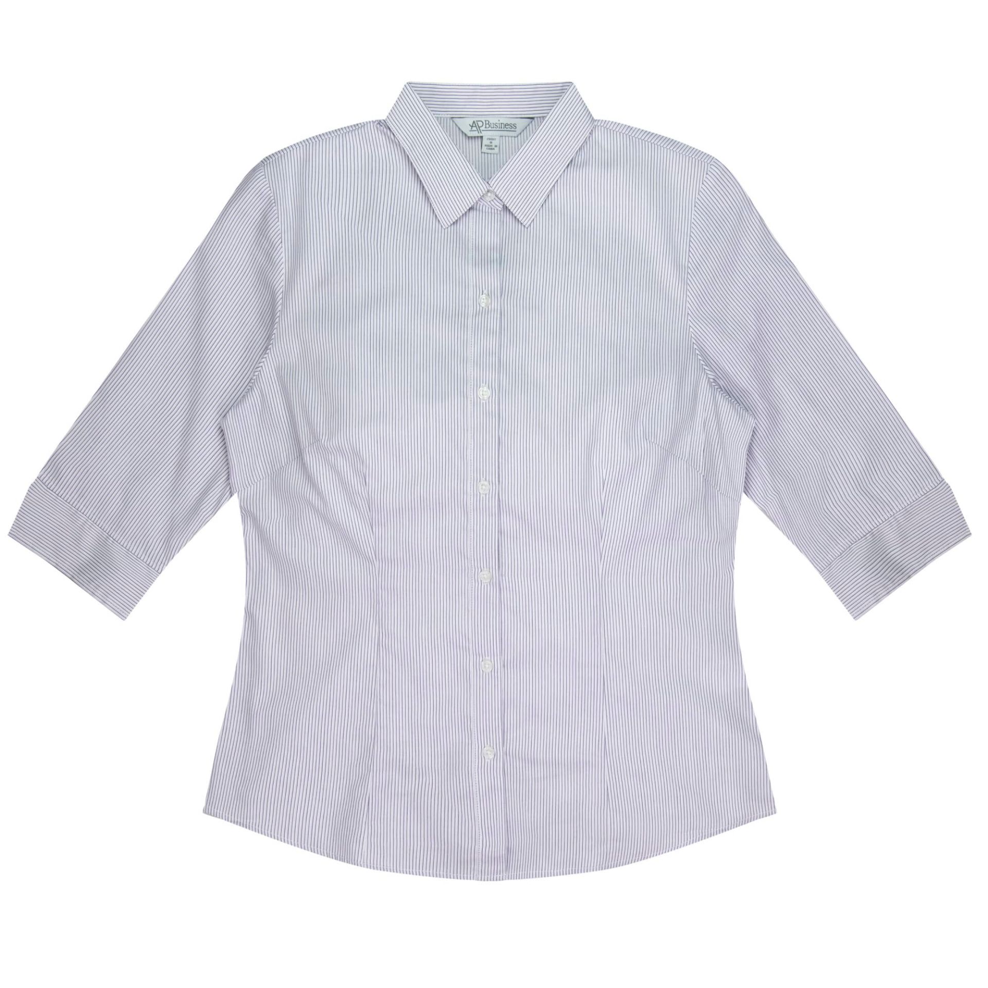 STYLE: 2900T Sizes: 4-26 Fabric: 65% Polyester 35% Cotton Features: A double turned Placket is edge stitched to match the Collar Stripes on the Sleeve cuff are cut on opposing directions to give a trendy contrast. Bust and waist darts create a slimline fit. Anti-pilling treatment 3 Colours: White/Navy, White/Purple, Black/Silver