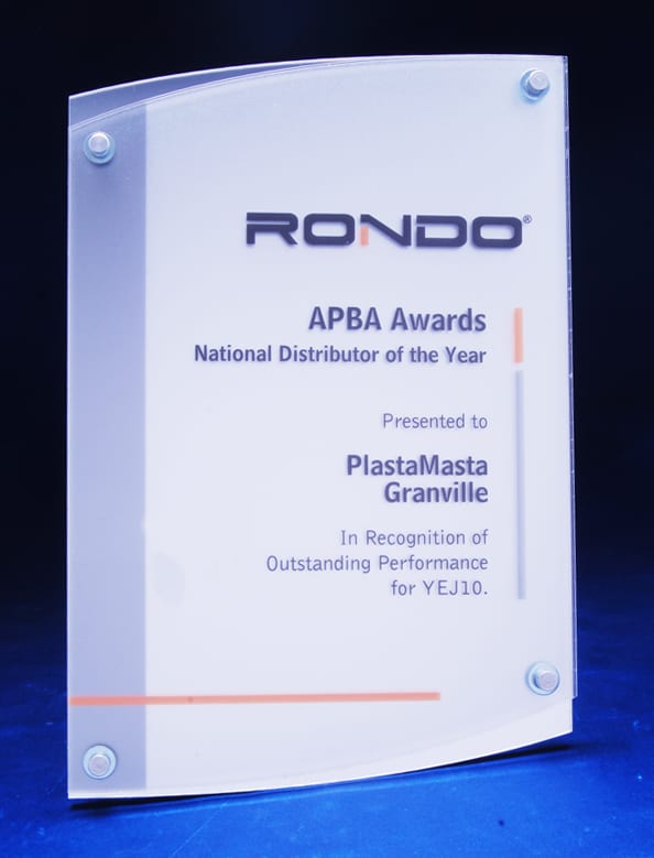 A popular contemporary style that is formed with layers of acrylics to produce a luminous effect. The front panle is offset cut to show top and botttom shiny trim. THis plaque is full colour printed. and assembled using metal panel bolts.