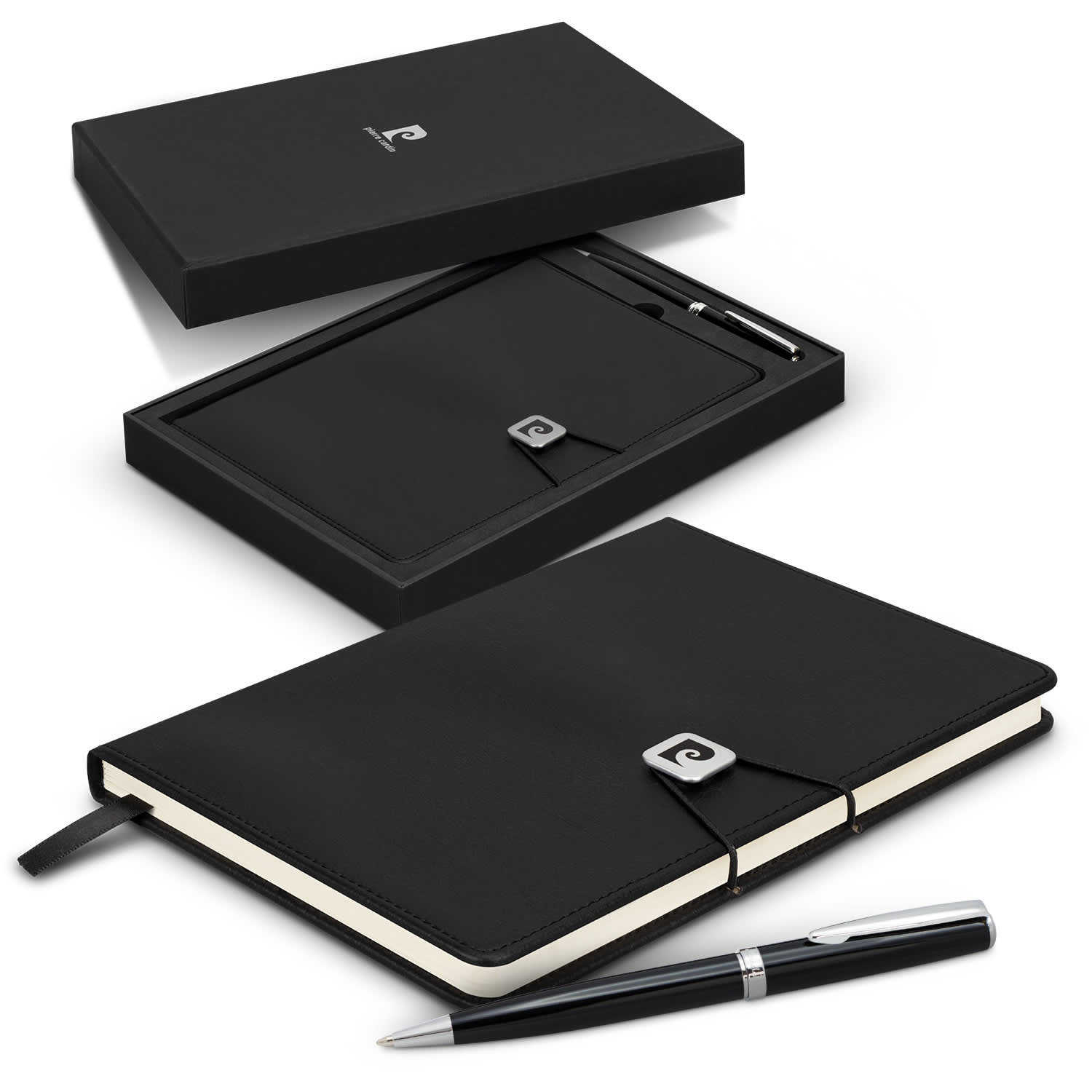 Stylish notebook and pen gift set. The notebook features 80 leaves (160 pages) of cream lined 80gsm paper and has a thermo PU cover with a branded metal buckle. Accompanying the notebook is a twist-action brass ballpoint pen with shiny chrome trim, and 4000m of black Dokumental ink. The notebook and pen are presented in a Pierre Cardin gift box. Features: * 80 leaves (160 pages) of cream lined 80gsm paper * Thermo PU cover with branded metal buckle * Pierre Cardin logo is debossed on the back cover * Timeless twist-action brass ballpoint pen with shiny chrome trim * 4000m of black Dokumental ink * Presentation: Colour and Notebook are colour matched in Pierre Cardin gift box.
