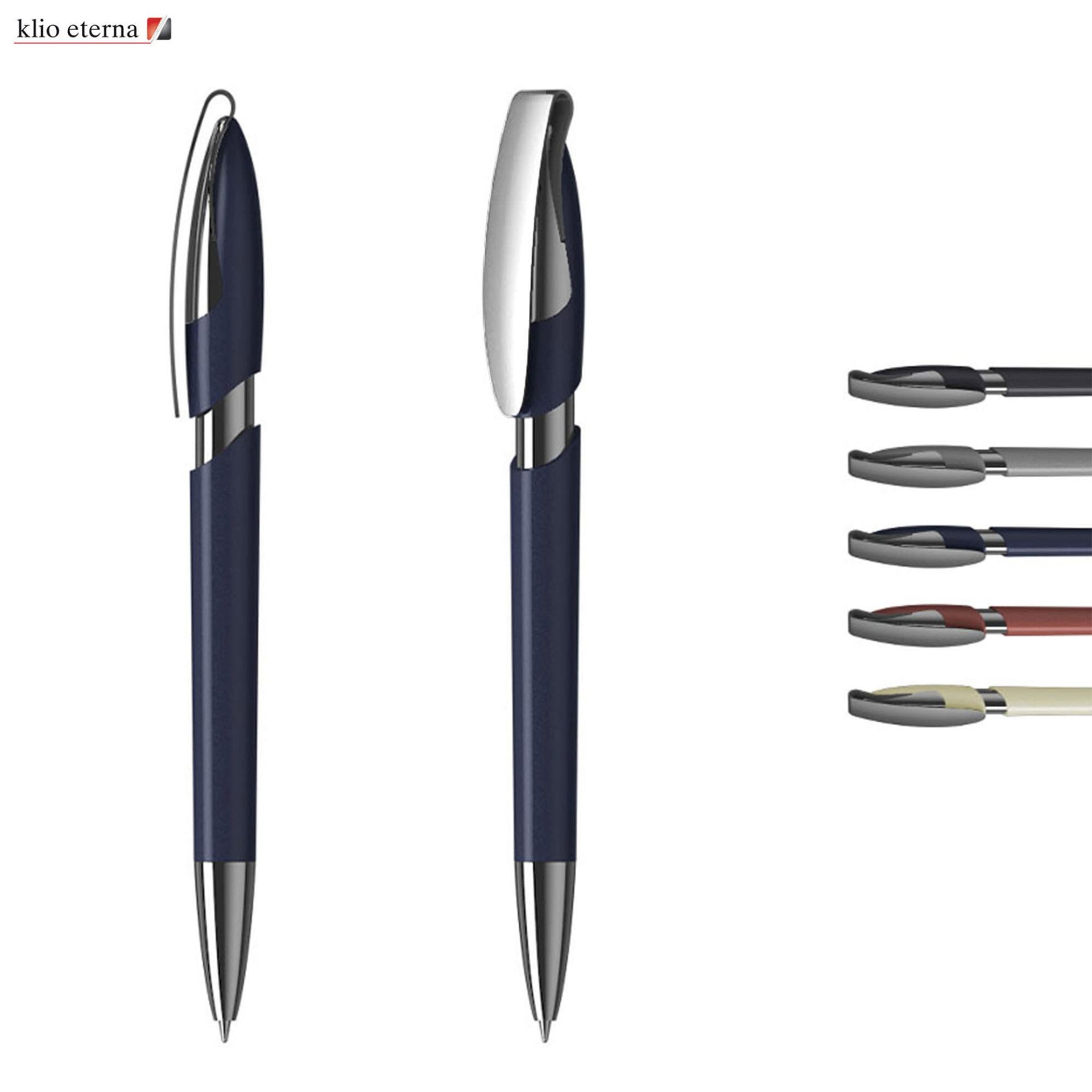 Klio - A Top European Brand, Est. 1900, sold world wide.Click action, metallic lacquered plastic pen with broad printing area clip, shiny brass nickel plated tip, clip and metalized shiny silver sleeve, high quality silktech Parker-Type German manufactured black ink refill(Quality acc. to ISO 12757-2/Shelf life 3 years), 5000 meters writing distance(5 times longer than China made pens), tungsten carbide ball provides you with quality writing. Germany Design and Make. Exclusive to Dex Collection in Australia and New Zealand. 500 units minimum per colour. Customised colours are available from 5,000+