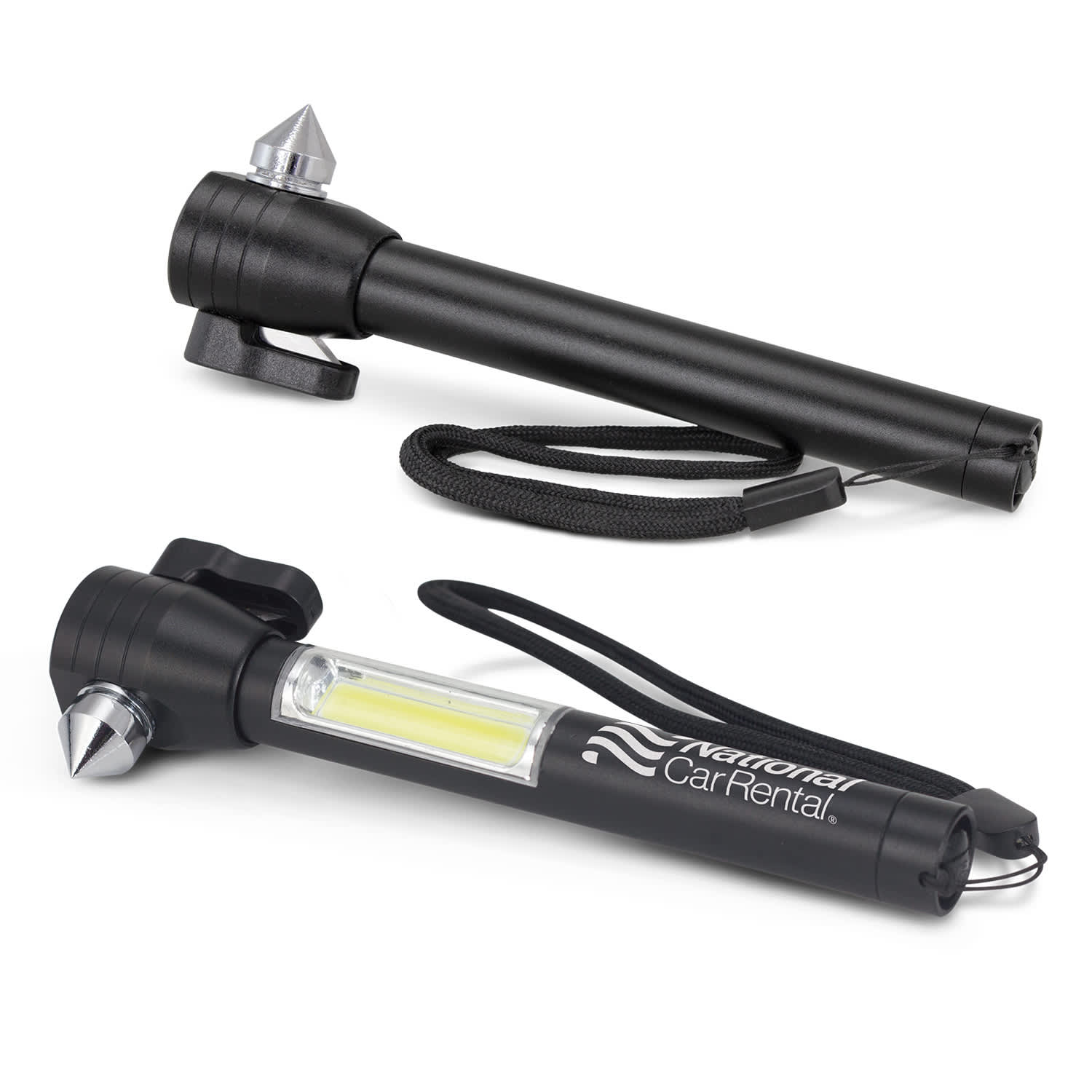 Compact multi-function metal safety tool for vehicles. It has a hammer for breaking glass, a seat belt cutter, a powerful warning light and a strong magnet for attaching it to the top of a disabled vehicle. The light uses radical COB (Chip-on-Board) technology which increases both the light intensity and the battery life. It has a handy woven wrist strap and is powered by one AAA battery which is included . Features: * Compact multi-function safety tool for vehicles * Includes: Window hammer, seat belt cutter, warning light and magnet, wrist strap * COB light for increased light intensity and battery life * Uses one AAA battery (included)